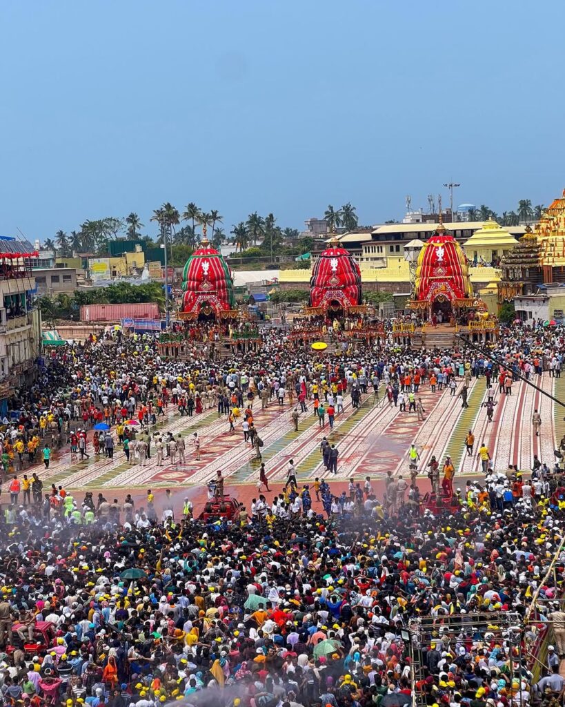 रथ यात्रा (27 जून, 2025): मुख्य कार्यक्रम! देवताओं को एक बड़े जुलूस (पहांडी) में ले जाया जाता है और उनके रथों पर रखा जाता है। फिर, भव्य जुलूस शुरू होता है। रथों को हजारों भक्तों द्वारा बड़ा डांडा, या ग्रैंड रोड के साथ गुंडिचा मंदिर तक खींचा जाता है, जो लगभग तीन किलोमीटर दूर है। कहा जाता है कि रथों को खींचने का यह कार्य पाप को मिटा देता है और आशीर्वाद लाता है। जब देवता अपने रथों पर होते हैं, तो पुरी का राजा ‘छेरा पंहारा’ अनुष्ठान करता है, जिसमें वह रथ के प्लेटफार्मों को सुनहरे झाड़ू से झाड़ू लगाता है। इसका मतलब है कि भगवान का किसी के ख़िलाफ़ कोई पूर्वाग्रह नहीं है। गुंडिचा मंदिर आवास