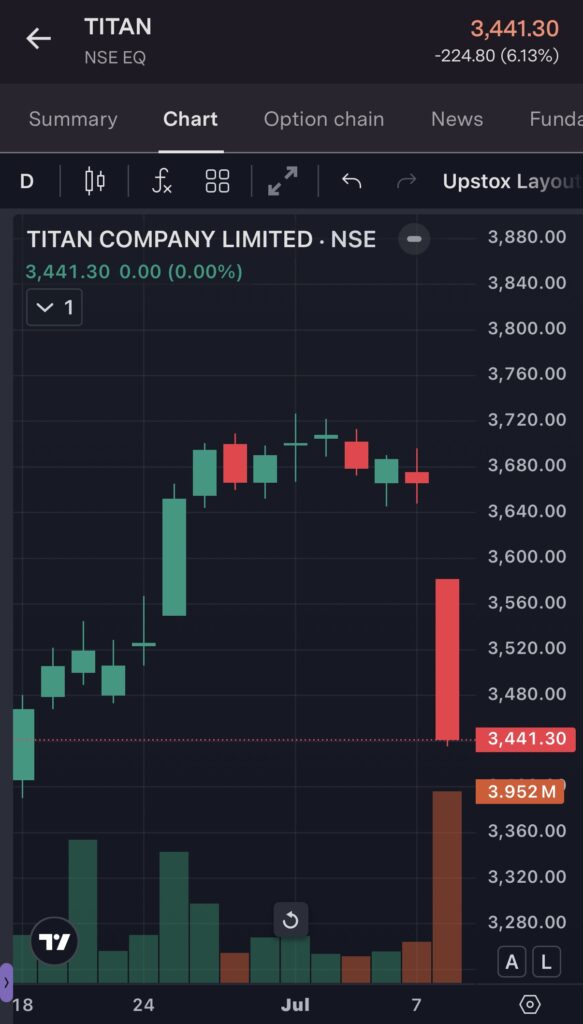 8 जुलाई को टाइटन कंपनी के शेयर 6% तक गिर गए, क्योंकि तिमाही रिपोर्ट में कंपनी का रेवेन्यू मार्केट की उम्मीदों से कम था। राजस्व वृद्धि